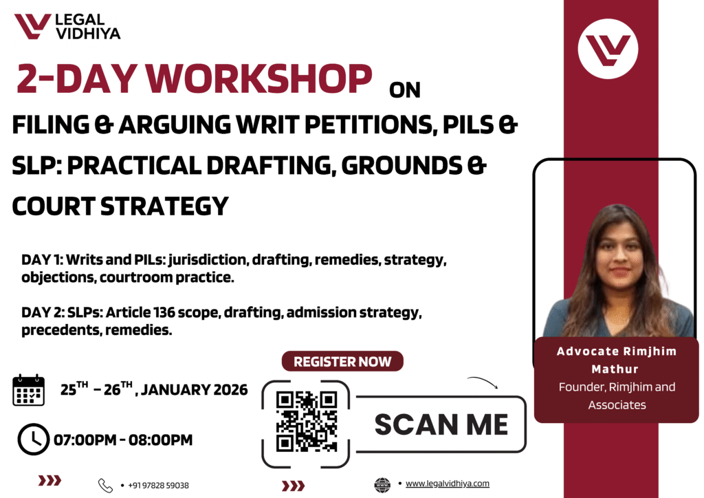 Legal Vidhiya presents a comprehensive 2-Day Workshop on “Filing & Arguing Writ Petitions, PILs & SLPs – Practical Drafting, Grounds & Court Strategy”, designed for law students, interns, young advocates, and legal professionals seeking hands-on exposure to constitutional litigation and Supreme Court practice.