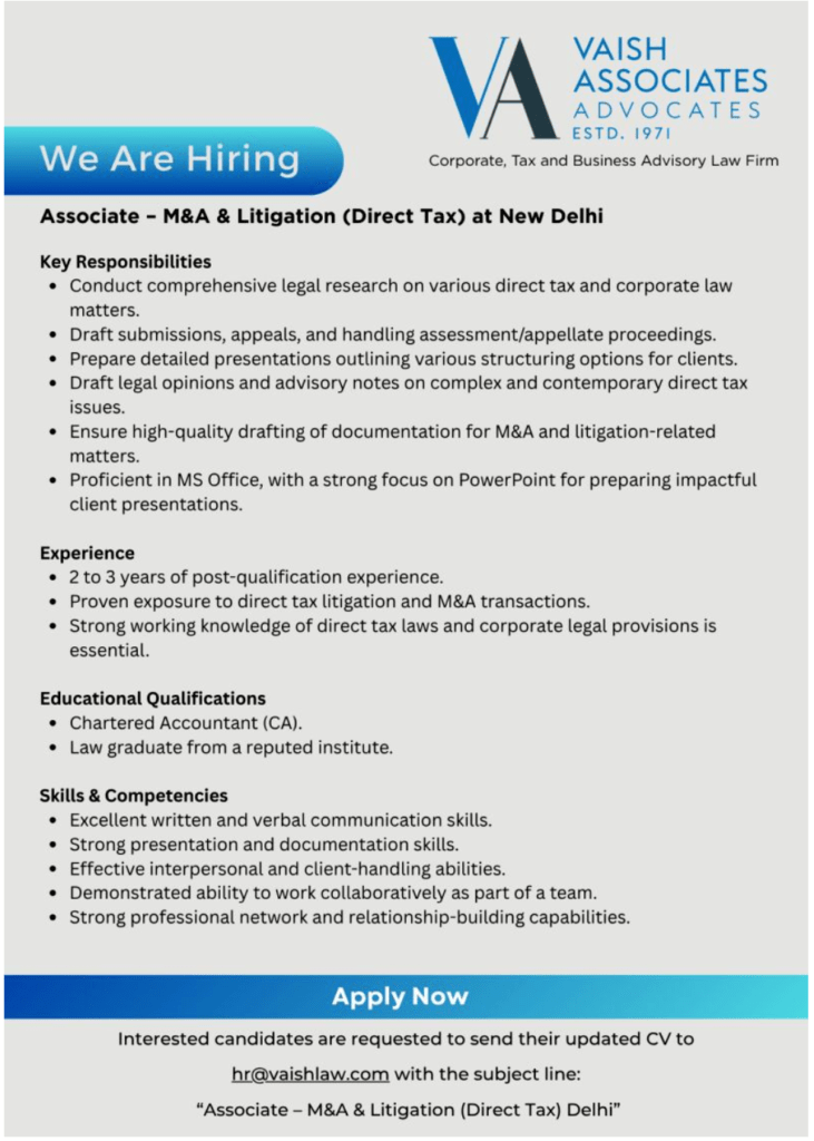 📌 Subject Line: Associate – M&A & Litigation (Direct Tax) Delhi