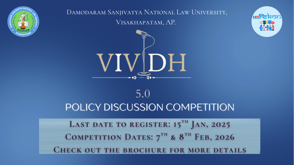Damodaram Sanjivayya National Law University (DSNLU), Visakhapatnam, through its student-run committee Drishtikon, is organising VIVIDH 5.0, a national-level policy discussion competition scheduled to be held on 7th and 8th February 2026 at the university campus. The competition seeks to provide a unique platform for law students across the country to engage with draft legislations, propose amendments, and deliberate upon public policy through structured and moderated discussions.