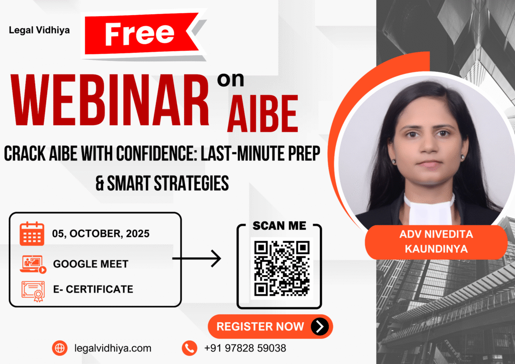 Join us for a FREE LIVE WEBINAR titled “Crack AIBE with Confidence: Last-Minute Prep & Smart Strategies” on 05 October 2025 at 05:00 PM IST, hosted by Legal Vidhiya. This exclusive session is tailored for law graduates and AIBE aspirants who are preparing for the exam and need focused guidance in the final stretch.