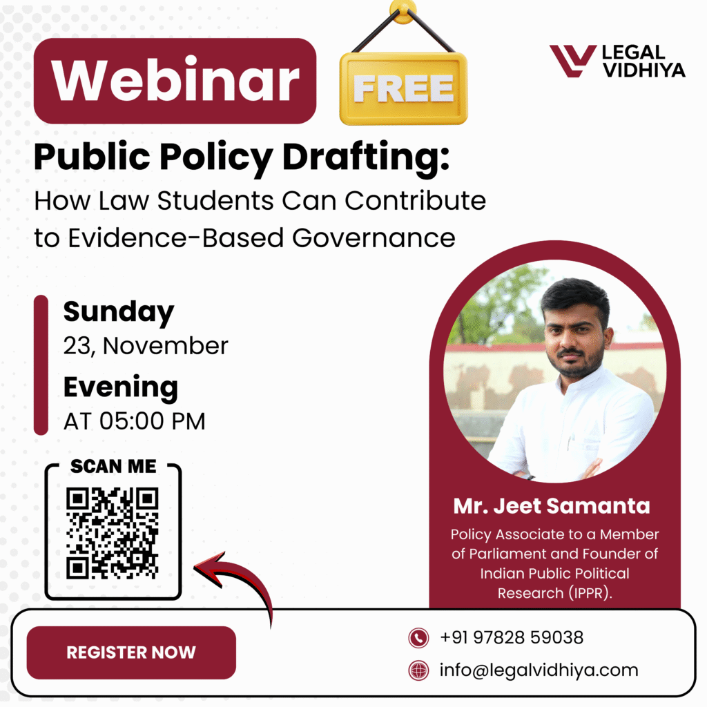 Join us for a FREE LIVE WEBINAR titled “Public Policy Drafting: How Law Students Can Contribute to Evidence-Based Governance” on 23 November 2025 at 05:00 PM IST, hosted by Legal Vidhiya. This session is designed for law students, policy enthusiasts, and aspiring public administrators who want to understand how public policies are drafted and how legal expertise plays a key role in shaping governance. The webinar will explain how evidence-based approaches improve the effectiveness and transparency of policymaking in India.