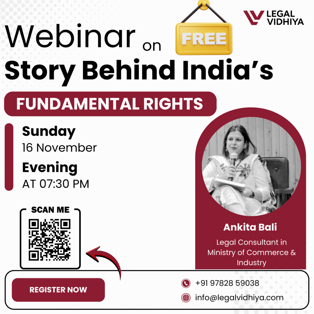 Join us for a FREE LIVE WEBINAR titled “The Story Behind India’s Fundamental Rights” on 17 November 2025 at 05:00 PM IST, hosted by Legal Vidhiya. This session is specially designed for law students, constitutional enthusiasts, and aspiring legal scholars who wish to understand the journey and importance of Fundamental Rights in shaping India’s democracy.