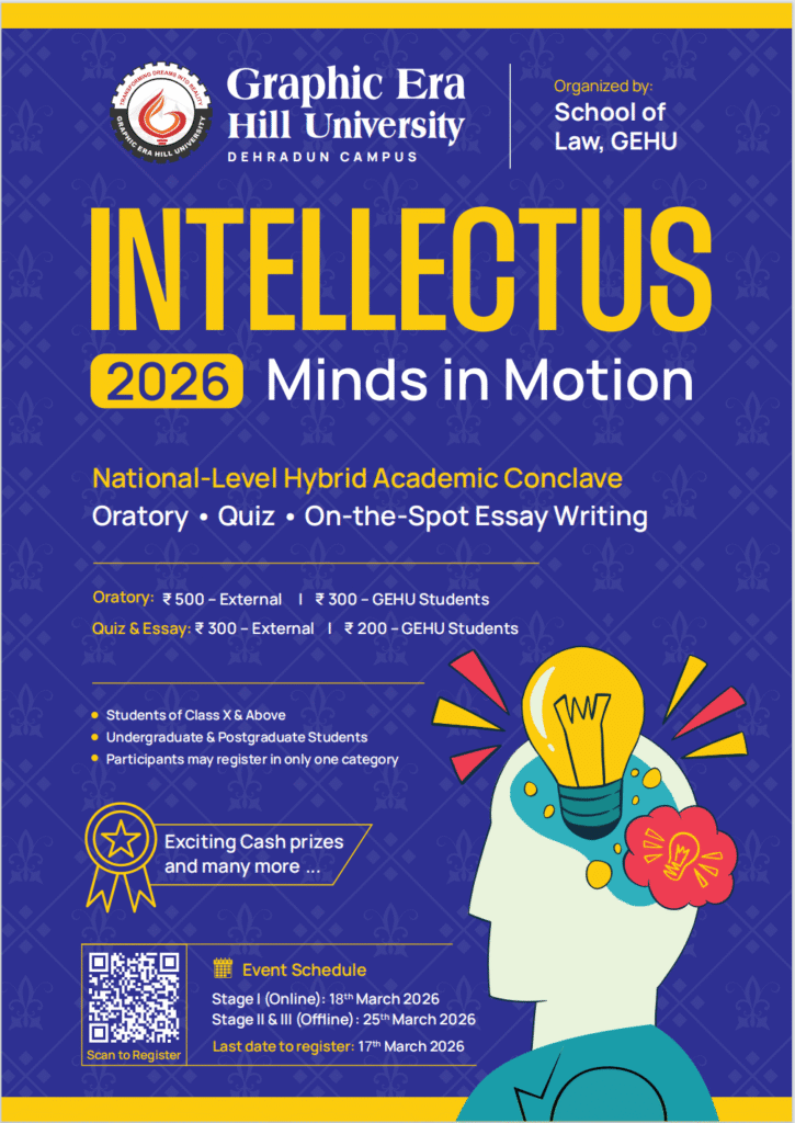 Intellectus 2026 – Minds in Motion is a National-Level Hybrid Academic Conclave organized by the School of Law (Debate Society), Graphic Era Hill University. It is conceived as a national platform dedicated to the celebration of disciplined thought and articulate expression.