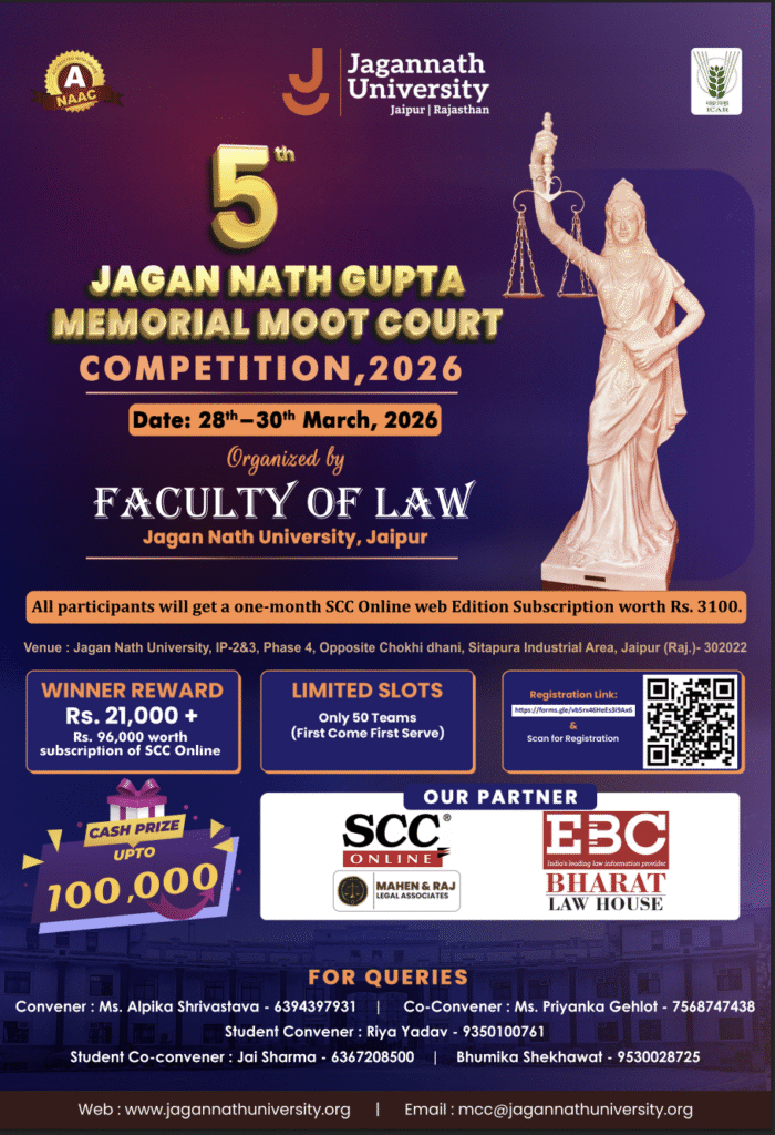 In these times, while we are combating the crisis that has precariously driven us to the edge of our existence, we at the Faculty of Law, Jagan Nath University are committed to a show of cooperative and collective resilience. We have planned to organize the Moot Court Competition on March 28-30th, 2026, to provide an opportunity where aspiring lawyers can enhance their legal proficiencies and mooting skills with a unique concept. We are looking for the participation of law students enrolled in the 5- Year (Integrated programme) and 3 Years LLB programme with the aim to inspire, promote and inculcate drafting & writing techniques, oratory skills and research skills.