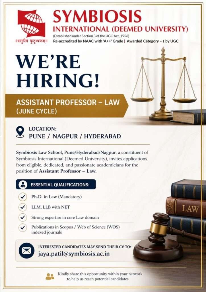 Job Opportunity: Assistant Professor – Law at Symbiosis Law School (Pune / Nagpur / Hyderabad)