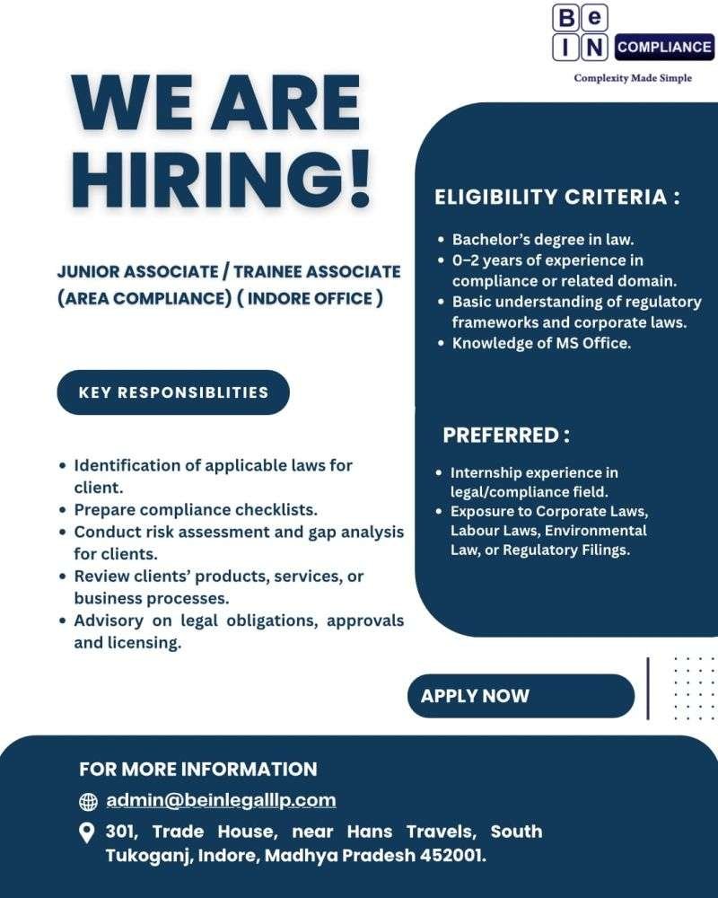 Job Opportunity: Junior Associate / Trainee Associate (Compliance) at BeIN Compliance (Indore)