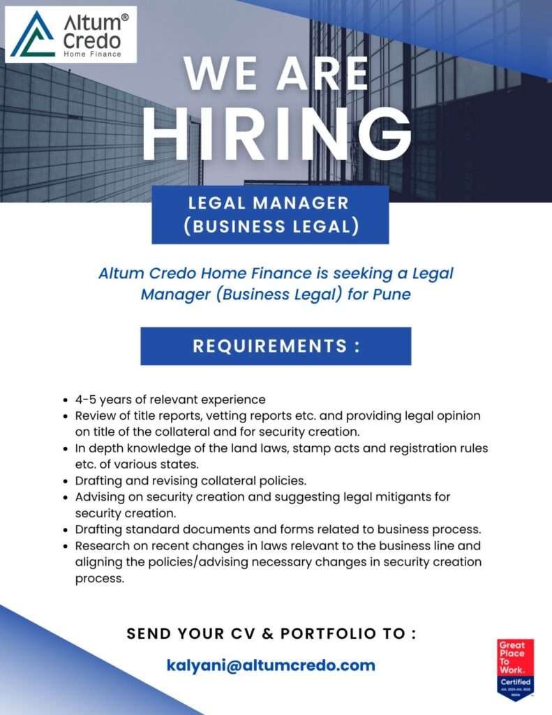 Legal Vidhiya brings to you an excellent opportunity for legal professionals to join Altum Credo Home Finance as a Legal Manager (Business Legal) at its Pune office.