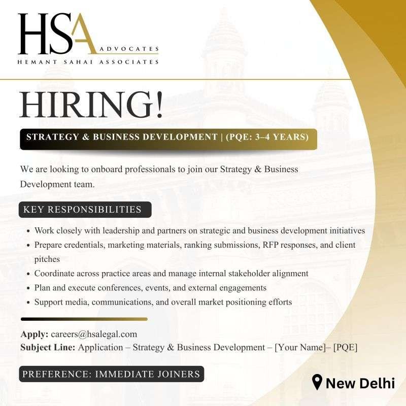 HSA Advocates is looking to onboard professionals for its Strategy & Business Development team. This role offers exposure to law firm growth strategy, client engagement, and market positioning, making it ideal for candidates interested in the business side of legal practice.