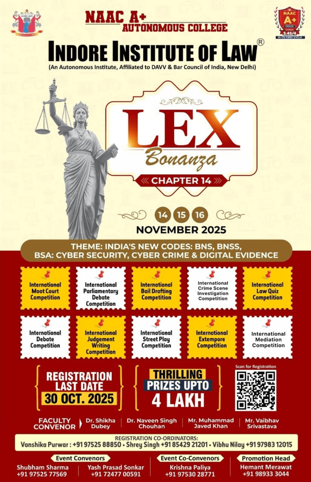 Indore Institute of Law is delighted to announce the 14th edition of Lex Bonanza, scheduled for November 14-16, 2025. This premier international law fest provides a platform for law students to showcase their skills, grow professionally, and network with legal experts. The festival went international in 2017, with teams from the UK, Bangladesh, and Nigeria, and continues to see global participation. Past editions have featured eminent legal figures such as former Chief Justice Dipak Misra, Altamas Kabir, and Justice Shantanu Kemkar.