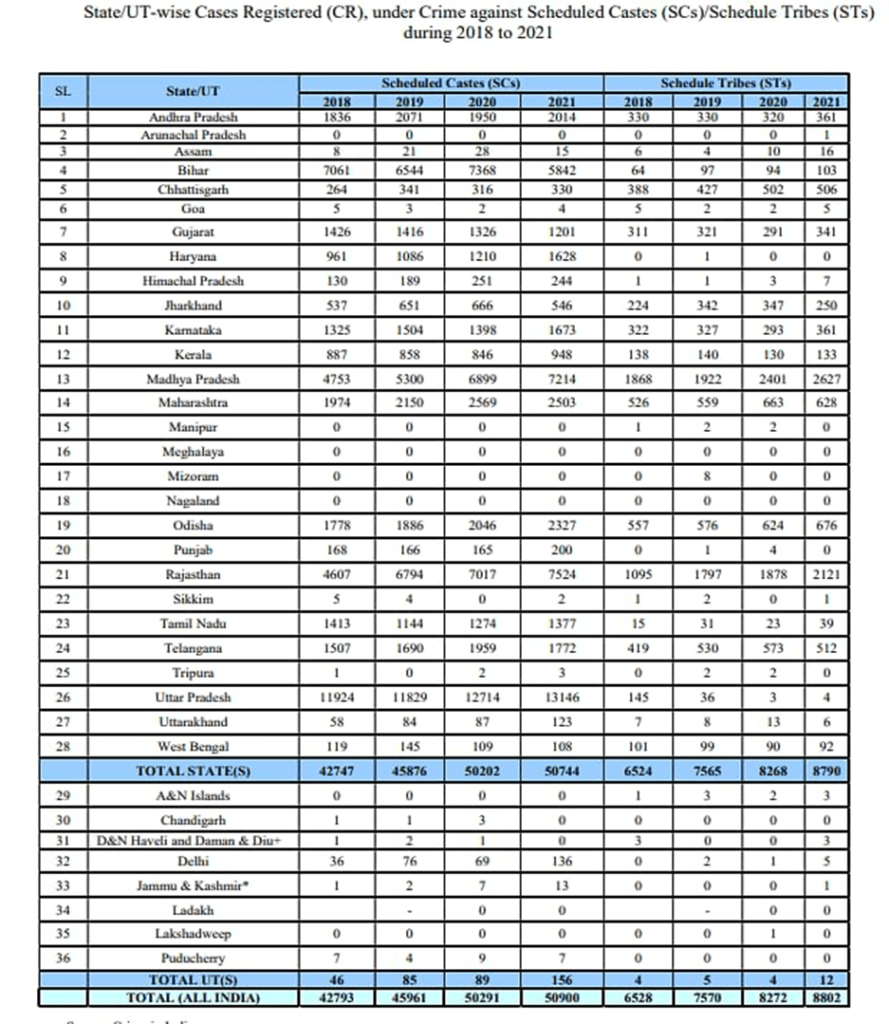 1,89,945 and 31,172 cases of crimes against individuals from Scheduled Castes and Scheduled Tribes, respectively, were reported nationwide between 2018 and 2021.