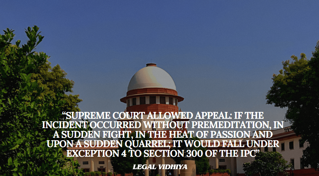 In a recent case decided by Supreme Court on 25.04.2024, the court partly allowed the appeal of the accused in a murder case registered under Section 302 of the IPC and altered the punishment to one under Part I of Section 304 of the IPC as the case fall under Exception 4 to Section 300 of the IPC.