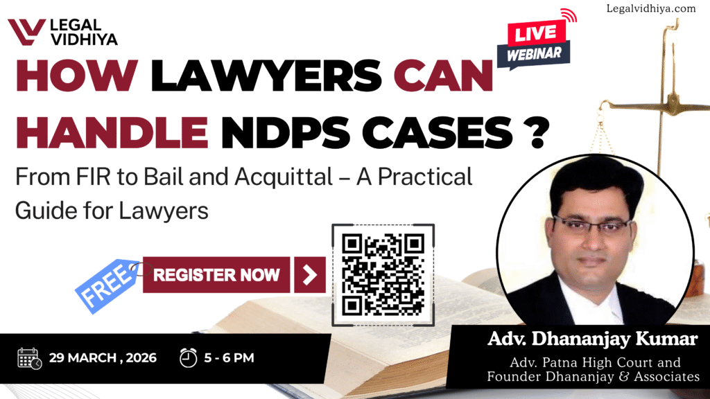 Join us for a FREE LIVE WEBINAR titled “How Lawyers Can Handle NDPS Cases? From FIR to Bail and Acquittal – A Practical Guide for Lawyers” on Sunday, 29 March 2026, from 05:00 PM to 06:00 PM IST, hosted by Legal Vidhiya. ⚖️📚